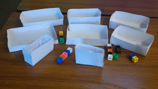 We had another lesson on calculating the volume of more complex prisms including problems where they were given the volume and hade to work out a missing length or area. Then in today's lesson we looked at the cuboid challenge where you give students a single piece of paper and ask them to make an open-topped box with the greatest possible volume. I think this task is usually done as a nice introduction to calculus, or at least plotting the graph of a cubic equation (nrich, as always, have explanations of how it works if you're not sure http://nrich.maths.org/6399/solution ). But, much as I feel a bit pained to say it, I wasn't bothered about the algebra this time. I wanted students to get a feel for dimensions and to have a go at a practical version of trial and improvement. I also wanted to make a big deal of the second part of the challenge, where I gave them 4 multi-link cubes each and asked them to work out how many whole cubes they could fit in their boxes.